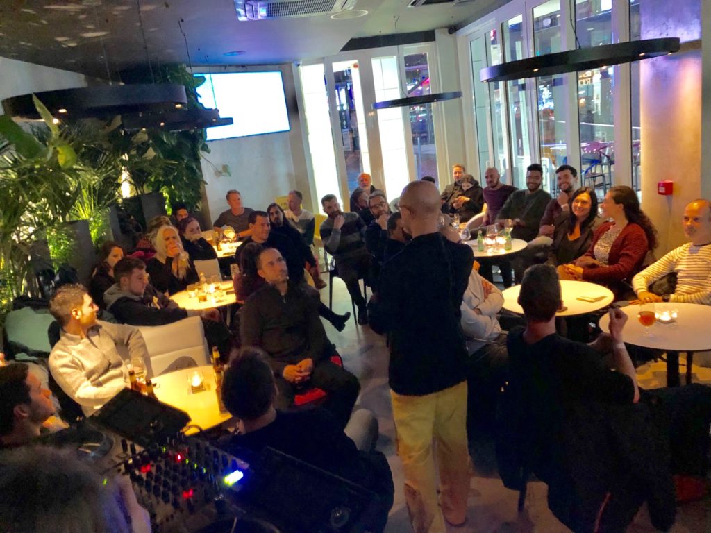 A room filled with Blexrians and those members of the public who signed up for this free event split into groups and were visited by the three guest speakers, as well as Luca himself.